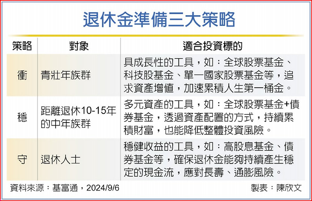 當距離退休年限10~15年,也累積一筆不小的財富,此時,投資策略應轉向「穩」,也就是透過資產配置的方式,分散布局多元資產,例如成長型的股票基金、穩健收益的高股息或債券型基金,在累積財富的過程中,也能降低資產波動風險。