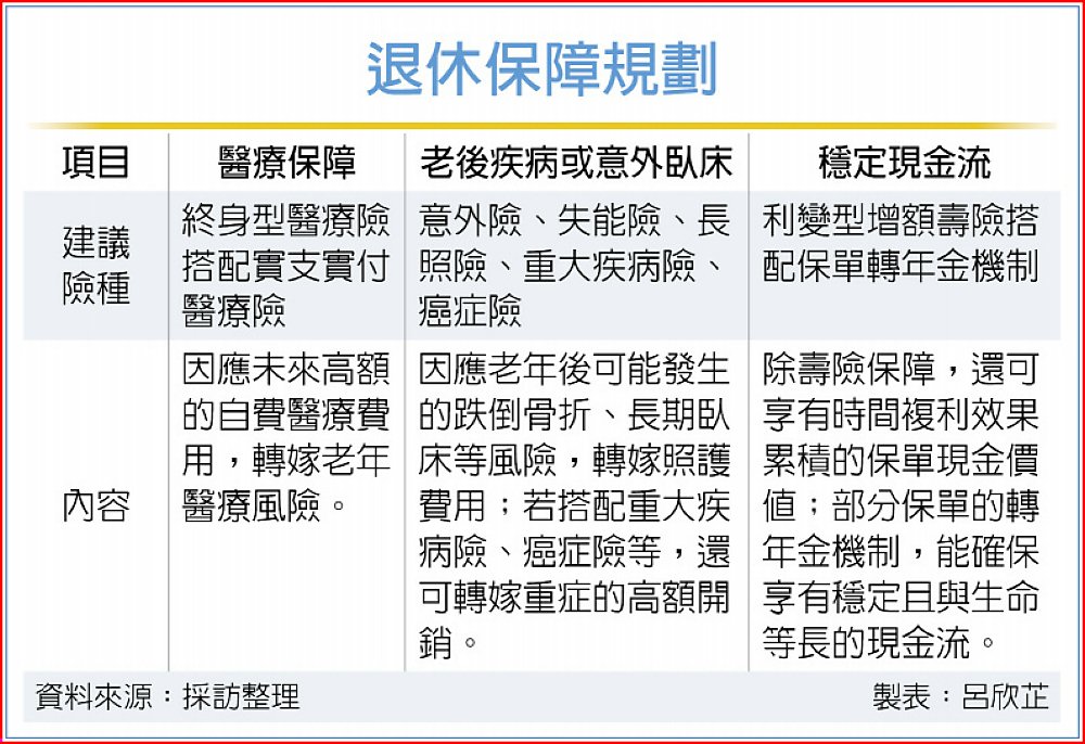 其次,可將意外險、失能險、長照險納入保險配置,因應老年後可能發生的跌倒骨折、長期臥床等風險,藉此轉嫁照護費用。永達保經表示,市面也有保險公司推出「類長照」複合式保單,將終身壽險、意外失能、特定傷病引起的長照需求納入保障範圍,讓老後醫療更有保障;此外,也可視個人需求及預算搭配重大疾病險、癌症險等,來轉嫁重症的高額開銷,保障老年財務安全。