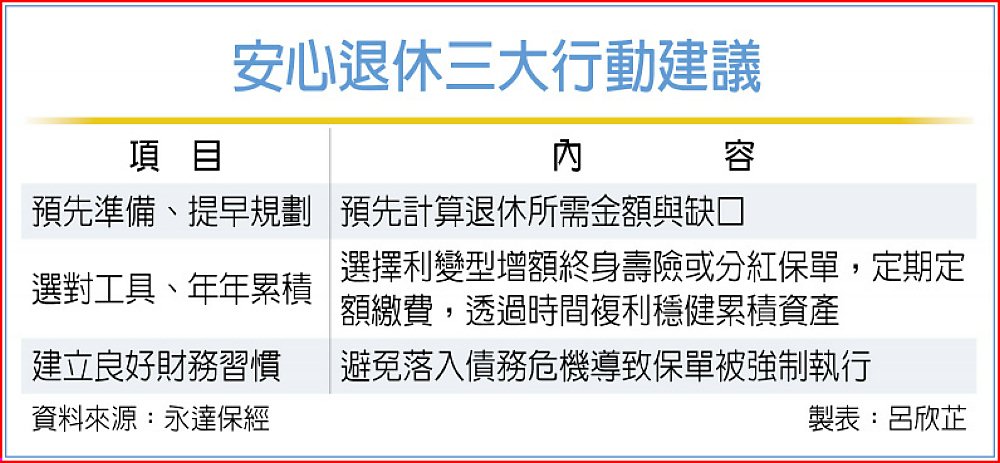 永達保經提出安心退休三大行動建議,首先是預先準備、提早規劃,預先計算退休所需金額與缺口;其次是選對工具、年年累積,可選擇利變型增額終身壽險或分紅保單,定期定額繳費,透過時間複利穩健累積資產;最後是建立良好財務習慣,避免落入債務危機導致保單被強制執行。