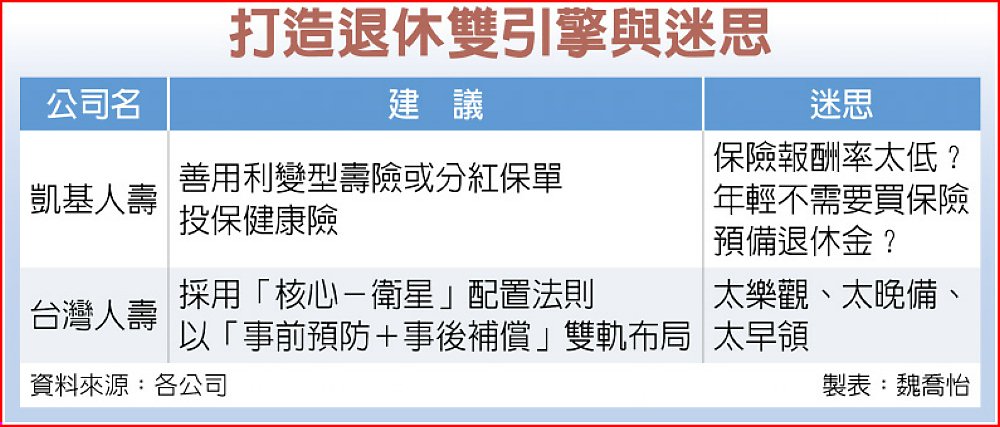 凱基人壽指出,利變型壽險或分紅保單可兼顧保障及退休金準備。利變型壽險或分紅保單結合保險保障與穩健收益,保單價值準備金具長期穩健增長的特性,協助民眾退休金準備。此外利變型壽險還有機會透過宣告利率、分紅保單有機會透過紅利分享額外獲得增值回饋分享金或保險單紅利,助攻退休金累積。另外,建議必備住院醫療險(日額及實支實付)、防癌險、重大傷病、長照險等,逐步堆疊保障,確保退休後享有一定品質之醫療照顧及生活。