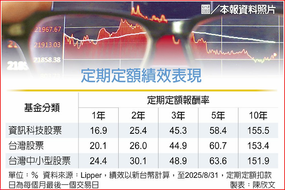 根據台灣可銷售基金的10年定期定額投資績效統計,表現最佳的類別分別為資訊科技股票、台灣股票及台灣中小型股票基金,定期定額10年的報酬表現都超過150%。雖然上述的基金波動度較高,但也意味著報酬潛力更大,有助年輕族群快速累積人生的第一桶金。