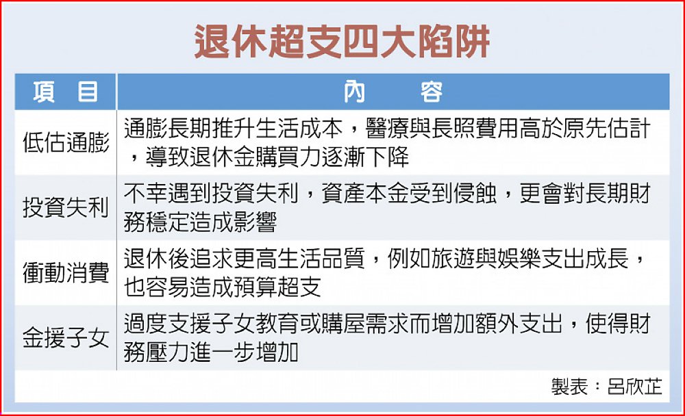 兆豐銀行指出,退休族群最常見的超支情形,多半來自於醫療與長照費用高於原先估計,再加上通膨長期推升生活成本,導致退休金購買力逐漸下降。部分退休族也會因子女教育或購屋支援而增加額外支出,使得財務壓力進一步增加;若退休後追求更高生活品質,例如旅遊與娛樂支出成長,也容易造成預算超支。此外,如不幸遇到投資失利,資產本金受到侵蝕,更會對長期財務穩定造成影響。