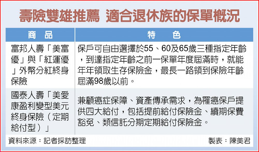 壽險雙雄推薦 適合退休族的保單概況