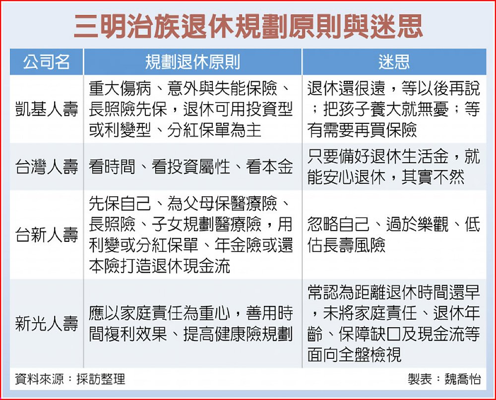 新光人壽認為,三明治族群往往認為距離退休時間還早,未將家庭責任、退休年齡、保障缺口及現金流等面向全盤檢視,導致沒有提早規劃保險,錯失資產累積與保障成本較低的黃金期。此外,也可能過度依賴政府退休金,低估未來通膨與長壽風險,屆時實際退休品質將不如預期。建議應提早布局、分階段完成保障規劃,才能有安心的老年生活。
