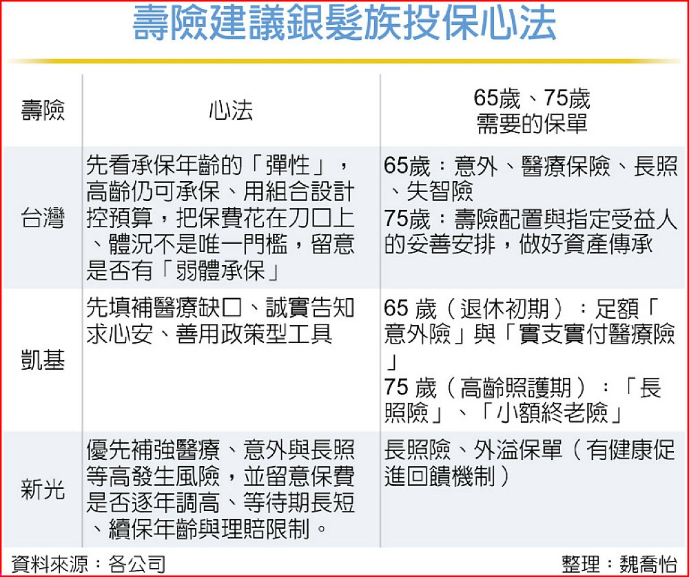 台灣人壽建議三心法,一是先看承保年齡的「彈性」,高齡仍可承保,高齡友善保單已陸續放寬年齡上限,以台灣人壽為例,多張商品承保年齡已可接受超過75歲以上,讓較晚意識到需求者,能夠補強晚年風險防線;二是用組合設計控預算,把保費花在刀口上,善用政策型「小額終老保險」或以「壽險搭配一年期附約」,以相對親民的保費補齊醫療與身故缺口,於可負擔範圍內精準配置必要保障。